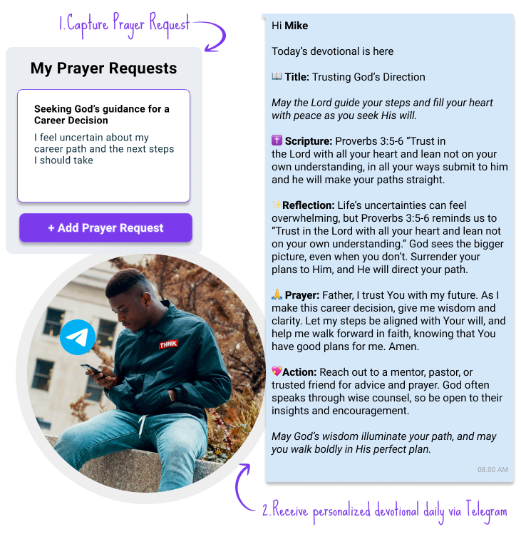 Personalised devotionals and audio sermons tailored to your prayer requests and thanksgivings, delivered directly via Telegram chat.